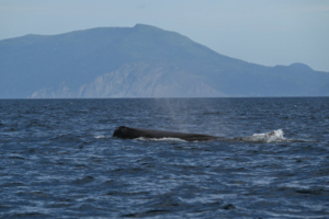 この季節はマッコウクジラが見られます。港からだいぶ走ってマッコウクジラを発見、船のすぐ近くに浮上している個体もあって、その大きさにびっくり。目の前で潜水するマッコウクジラを見ることができました。