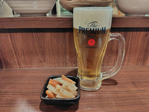 串焼き5本盛り、げんサラダ、枝豆、生ビール