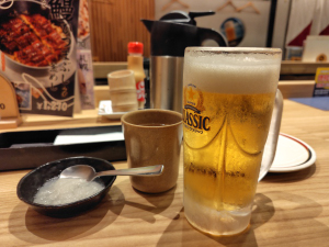 生ビール、お通し(大根おろし、鳥ガラスープ)