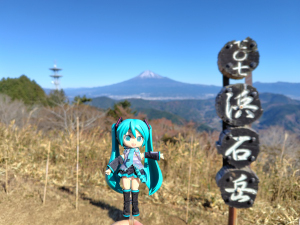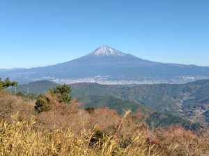 旧野外活動センター駐車場から杉林の山道を歩き、薩埵峠への分岐から山頂への直登暫しで展望が広がる浜石岳山頂に到着。目の前の富士山に大感激。