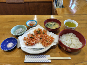 駅前のお食事処「あおぞら」さんで名物の“桜海老定食”を頂きました。由比でとれる桜海老のかきあげや桜煮(干し桜海老の佃煮)、しらすの釜揚げ。とてもごはんがすすみました。桜海老はとてもやさしい感じで、由比ならではの味わいです。調理はとても丁寧です。