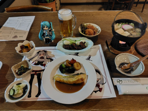 ホテルの天然温泉で寛ぎ、美味しい夕食で生ビール、地酒が進みました。