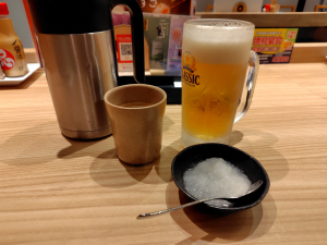 生ビール、お通し(大根おろし、鶏ガラスープ)