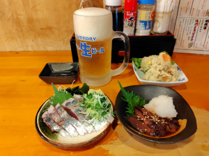 アジの刺身、ホタルイカの沖漬け、生ビール、ポテサラ