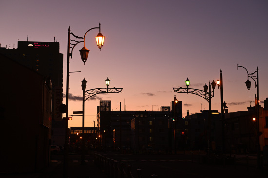 ぬさまい公園から夕暮れの幣舞橋の眺めです。