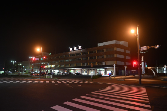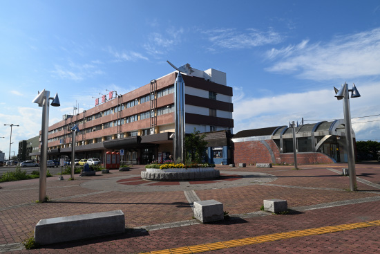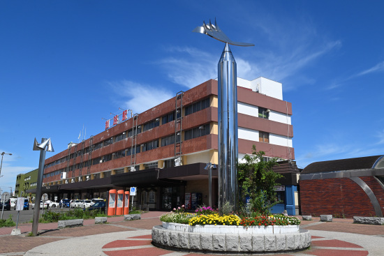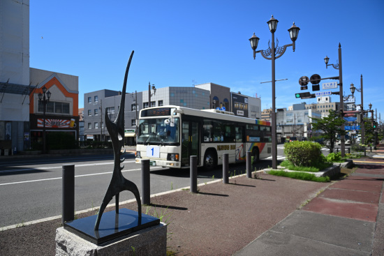NTTドコモ釧路ビルと「阿寒バス(丹頂カラー)」