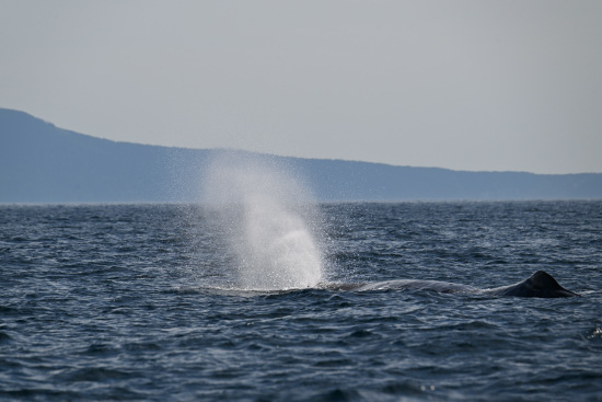 遠くにクジラの噴気(ブロー)が見えます。船はそこに向かって進みます。